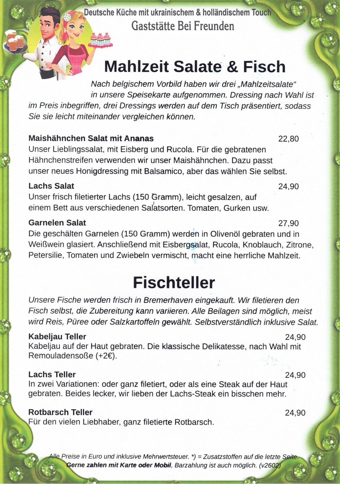 Ein frischer Spezial-Salat als Mahlzeit? Kein Problem, leckeres Essen muss nicht viele Kalorien haben! Oder Fisch, direkt aus Bremerhaven, selbst filetiert.
